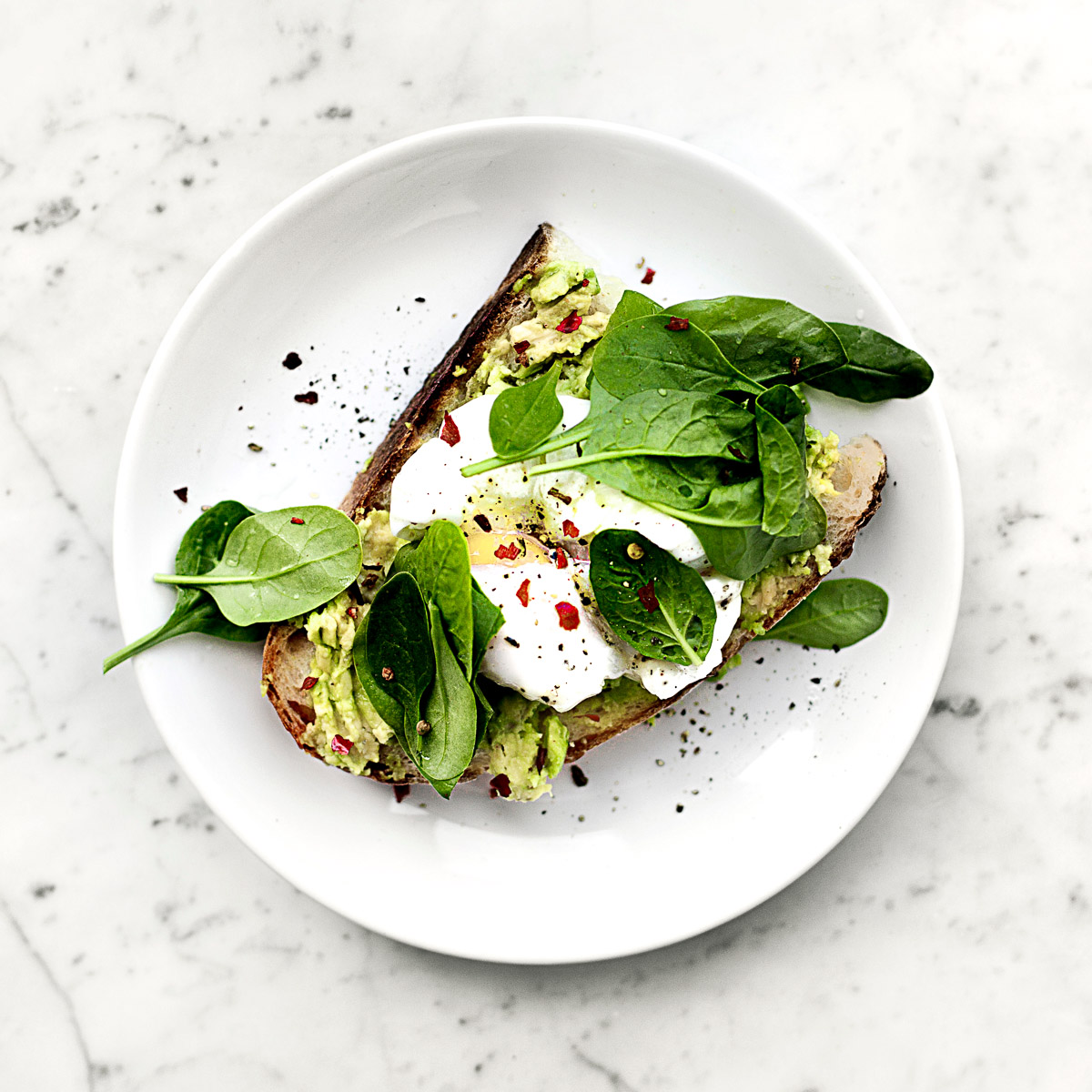 Smashed avocado, lemon, chili flakes, spinach, on sourdough toast